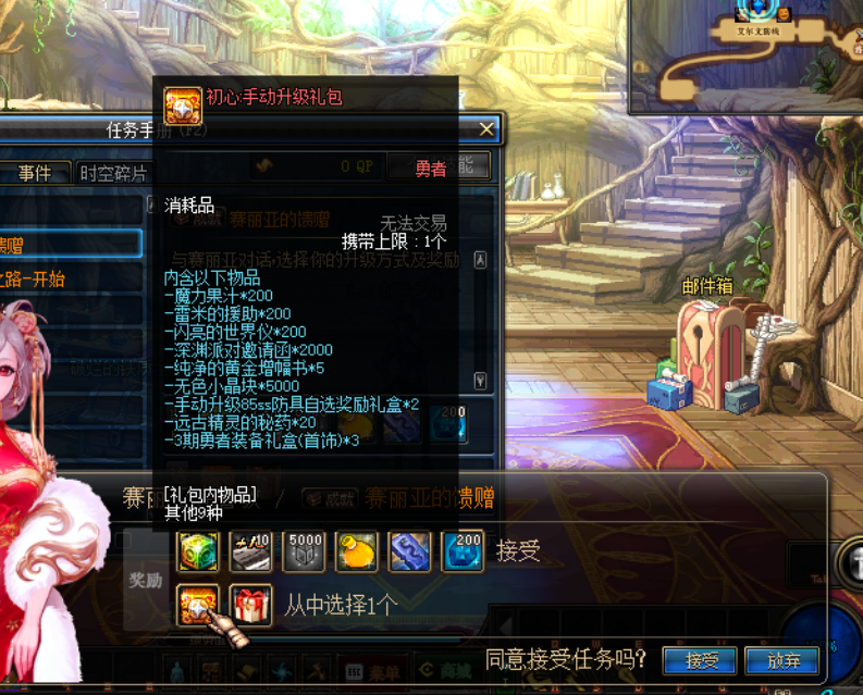 初始去商城、购买一套天空,各种契约黑钻,物品栏扩充卷,直升满级,转职,选好装备,记得完成赛利亚的任务(图一)。