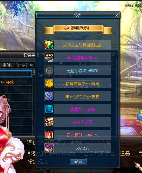 众神之主套装礼盒*1、+10装备强化卷*10、无色小晶体*5000、称号兑换卷一阶段*1、未开放的绝密-宠物*1、镇魂石*200、5万点卷、主线任务完成卷,记得先使用满级药剂在使用主线任务完成卷,不然任务完成不了!所有副本都有概率爆出极品东西,代币券礼盒,算是个福利天选之人吧,各种增幅卷红字书,装备史诗,很多自己体验就知道了!