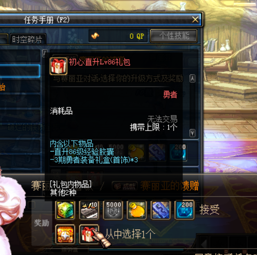 上线后完成赛利亚任务后,主动点开赛利亚任务接取赛利亚的馈赠,有两种路线礼包,手动满级20倍经验,和直升级满级礼包