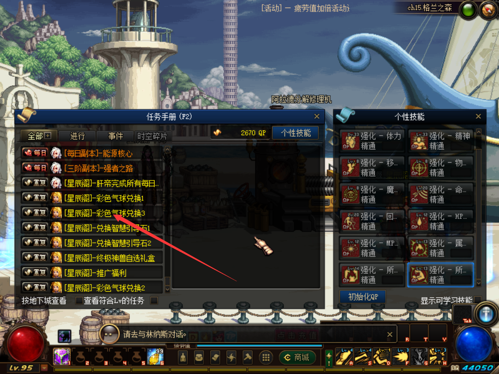 上线点击赛利亚升95级,然后吃经验胶囊可以直接到100...